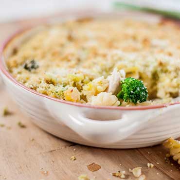 Stir in the broccoli florets, top with breadcrumb mix and bake for a further 20-25 minutes until the crumbs are golden brown.